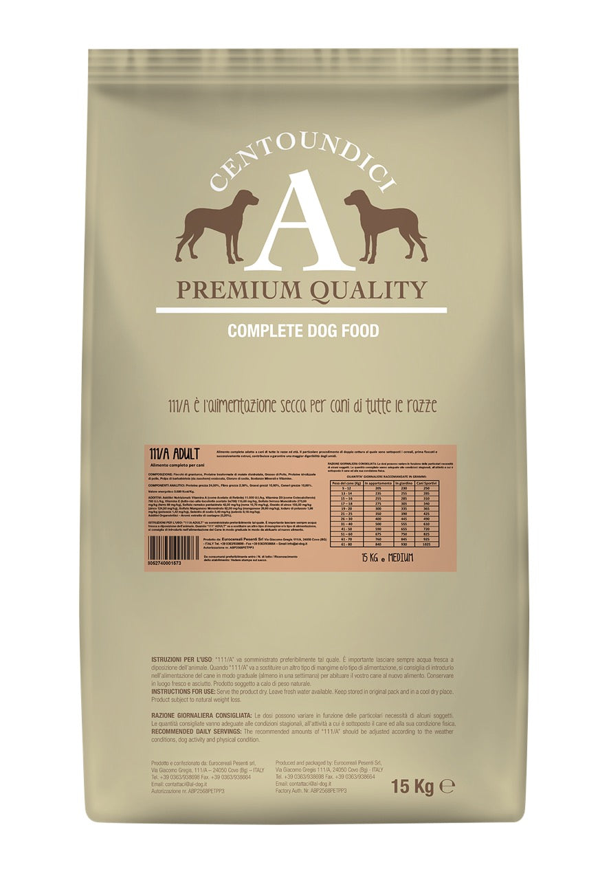 Suchst du ein zuverlässiges, ausgewogenes Futter für deinen erwachsenen Hund? 111/A Adult bietet eine robuste, energiebalancierte Rezeptur mit hochwertigen italienischen Zutaten – ideal für Hunde aller Rassen, egal ob klein, mittel oder groß. Durch die besondere Herstellung ist das Futter sehr gut verdaulich und sorgt für eine stabile, regelmäßige Verdauung.