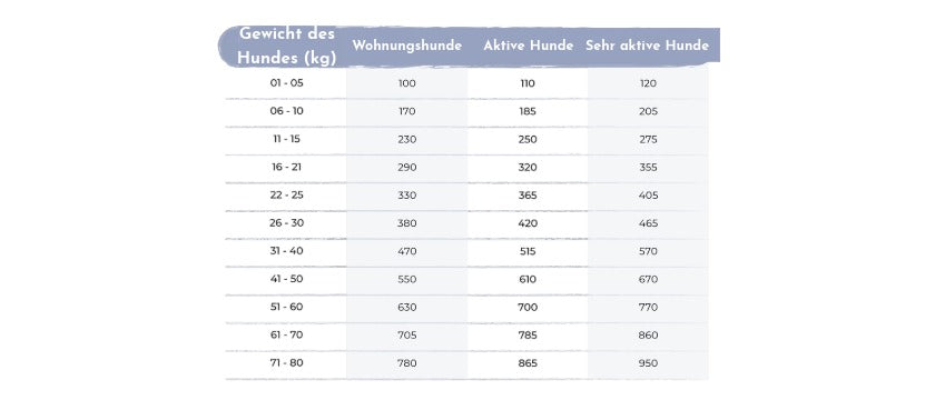 Die empfohlene Tagesmenge richtet sich nach Gewicht, Aktivität und individueller Konstitution deines Hundes. Die Angaben dienen als Richtwert und können bei Bedarf angepasst werden.
