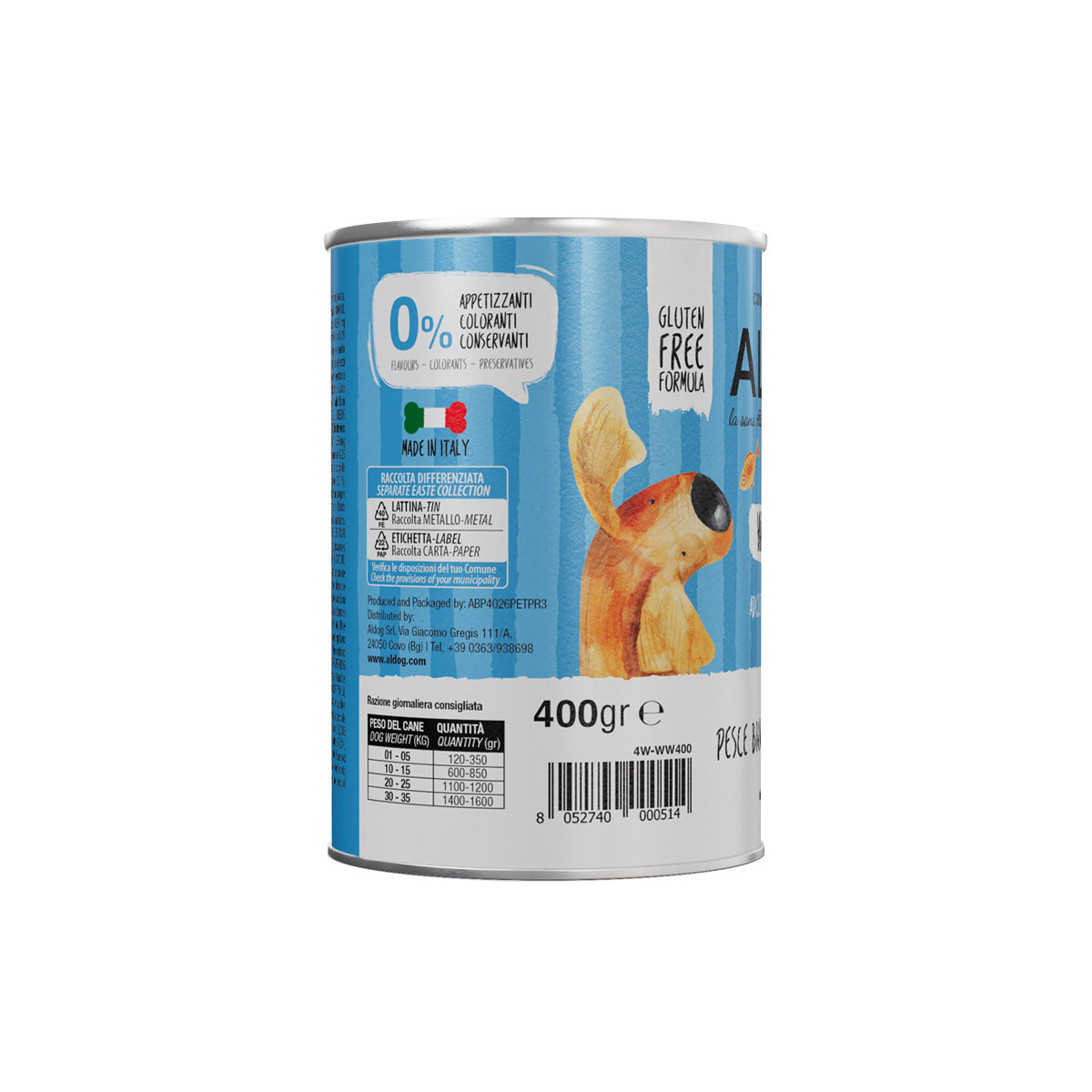 Dieses hochwertige Monoprotein-Paté besteht zu 96 % aus weißem Fisch (Merluzzo/Kabeljau, Orata/Dorade, Branzino/Wolfsbarsch).