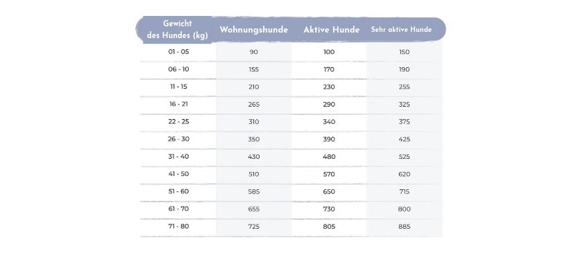 Die empfohlene Tagesmenge richtet sich nach Gewicht, Aktivität und individueller Konstitution deines Hundes. Die Angaben dienen als Richtwert und können je nach Bedarf angepasst werden.